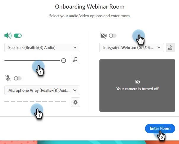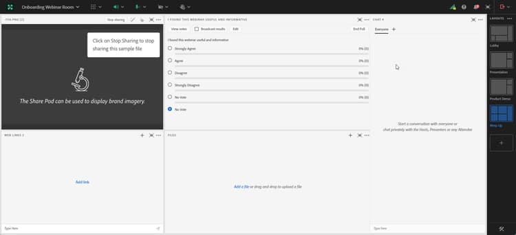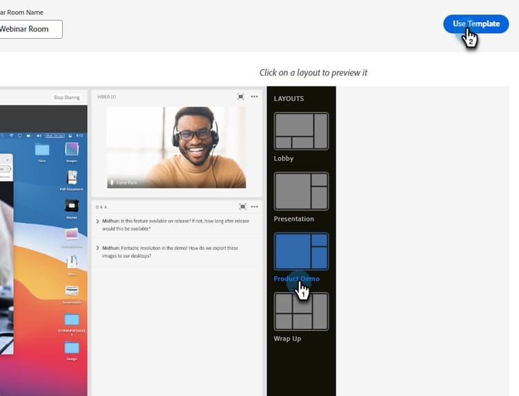 Pour plus d’informations sur les salles et les modèles, consultez la section « Modèles et dispositions des salles de réunion » de cet article d’aide d’Adobe.