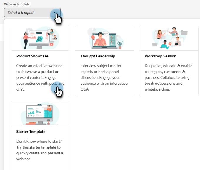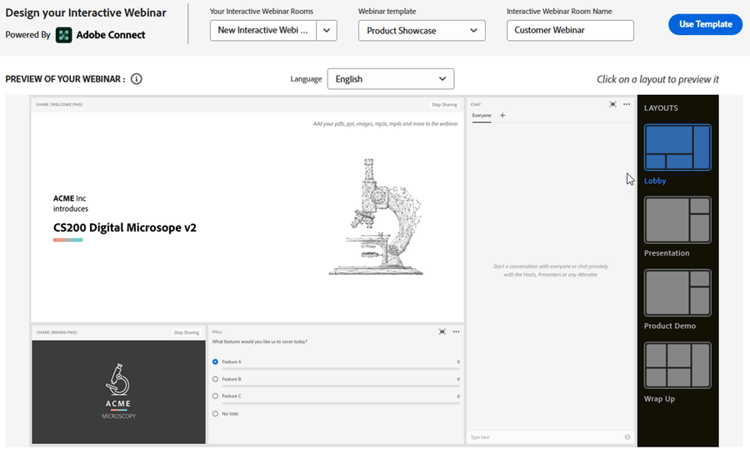 Modèle : structure fournie à une salle en fonction de l’objectif du webinaire diffusé. Par exemple, si vous souhaitez planifier un webinaire de présentation de produit, le partage d’écran est un composant essentiel pour présenter la démonstration. Le modèle garantit que les composants essentiels requis pour une diffusion efficace d’un type particulier de webinaire sont en place lors de la configuration de la salle de webinaire.
