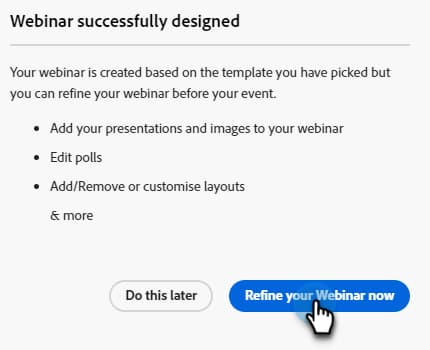 Vous pouvez affiner votre webinaire immédiatement ou ultérieurement. Faisons-le maintenant. Cliquez Sur Affiner Votre Webinaire Maintenant.