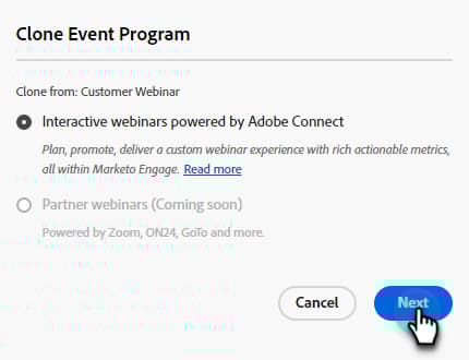 note note NOTE Pour le moment, vous ne pouvez enregistrer qu’un webinaire interactif cloné en tant que webinaire interactif. L’enregistrement d’un webinaire cloné en tant que webinaire partenaire (par exemple, Zoom, ON24, etc.) sera bientôt disponible. -