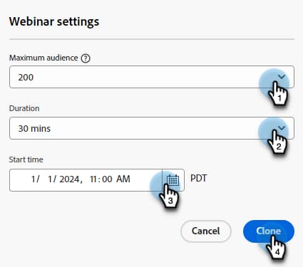 Sélectionnez les paramètres du webinaire cloné, puis cliquez sur Cloner.