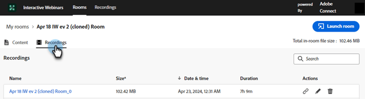 Sous Mes enregistrements, vous pouvez trouver tous les enregistrements disponibles dans la salle que vous avez créée. Vous pouvez également consulter leurs taille, date et heure respectives, ainsi que la durée des enregistrements.