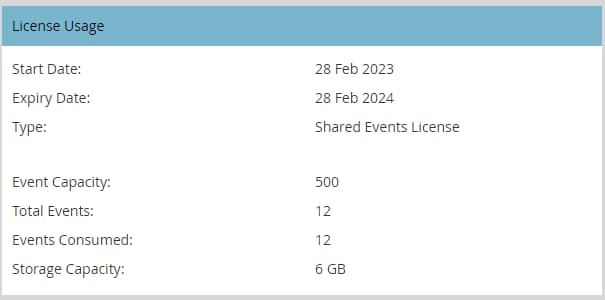 Le type « Licence de salle partagée » comporte un nombre illimité d’événements et « Licence de stockage supplémentaire » fournit uniquement l’espace de stockage. Le champ Total des événements pour ces licences sera donc simplement répertorié comme « - ».