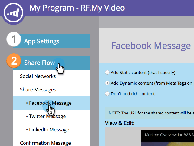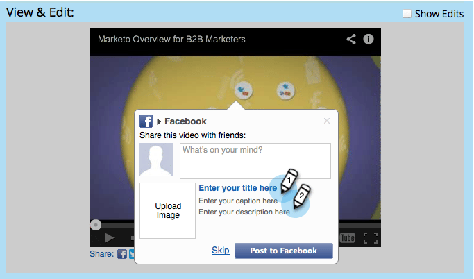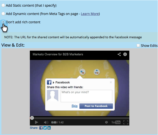 Marketo applications sociales permet à vos prospects de partager vos landing pages avec leurs connexions sur les réseaux sociaux tels que Facebook, Twitter, etc. Les balises OpenGraph de Facebook (balises de journalisation) vous permettent de spécifier quelles informations de votre page de destination sont incluses dans les publications Facebook.