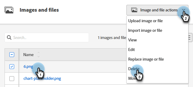 Recherchez et sélectionnez l’image/le fichier de votre choix. Cliquez sur la liste déroulante Actions relatives aux images et aux fichiers et sélectionnez Supprimer.