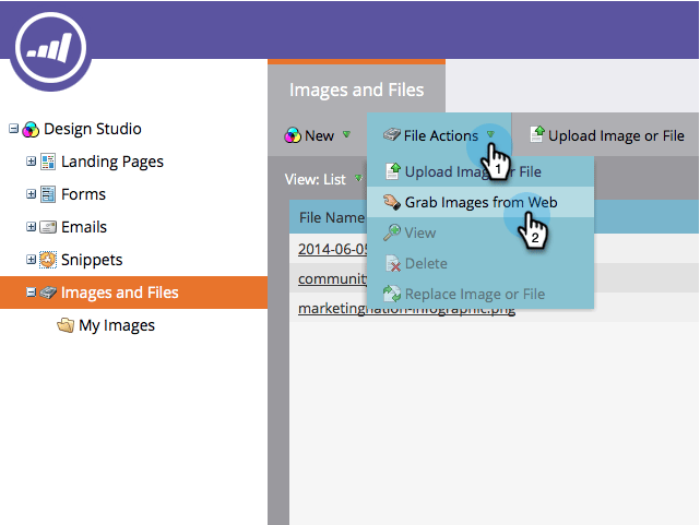 Vous pouvez charger des fichiers depuis Box pour les utiliser sur les landing pages et les e-mails.