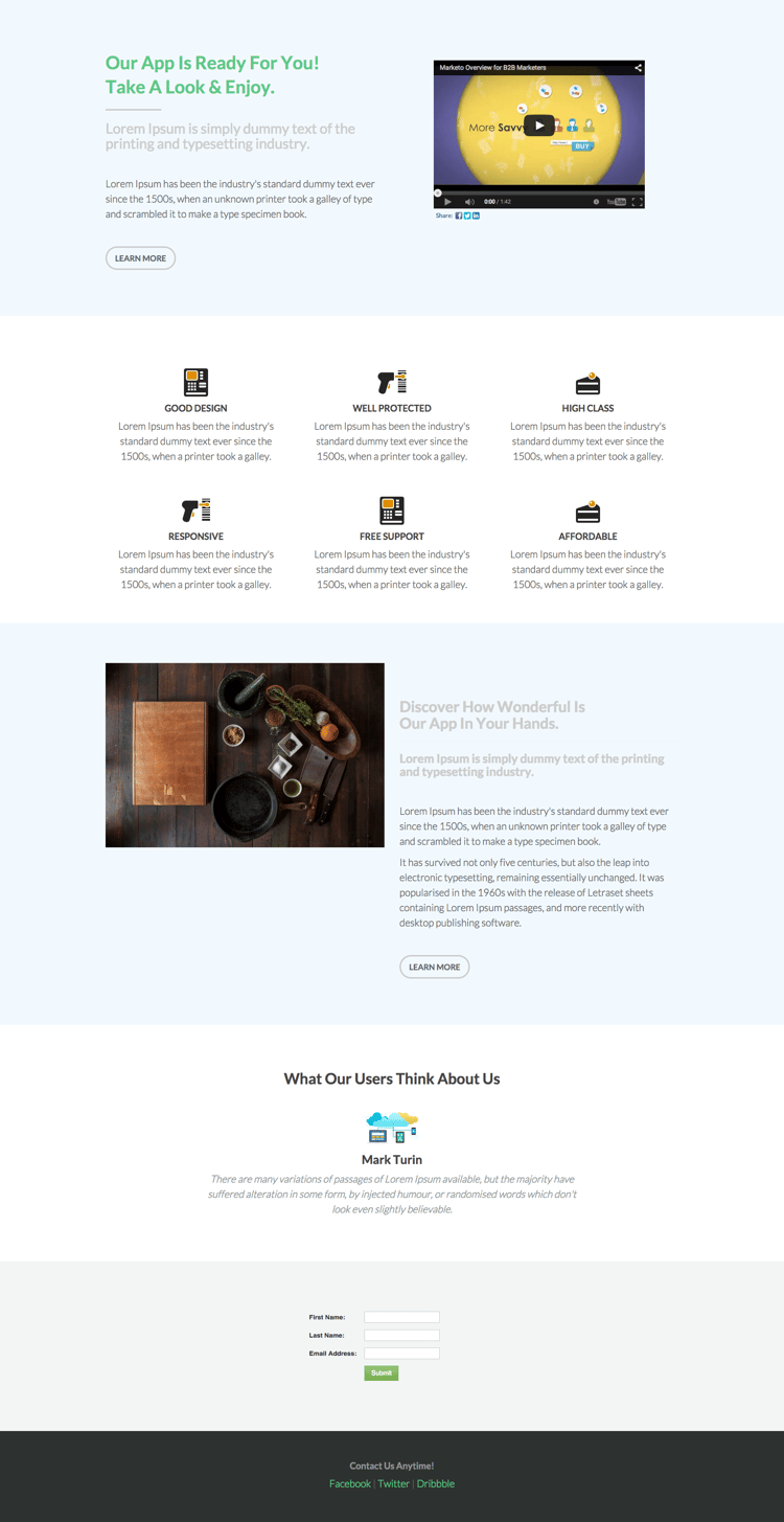 - comprend une vidéo de référence, un titre, un sous-titre, un corps de texte et un bouton.