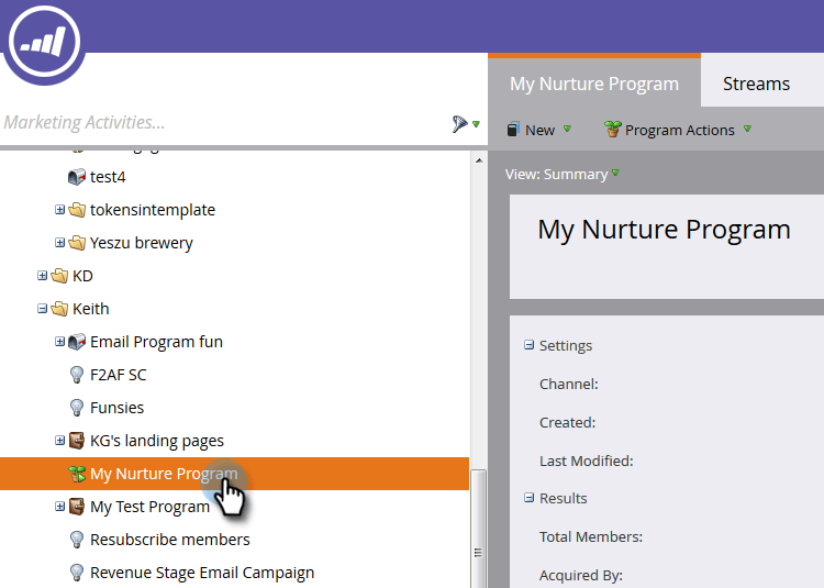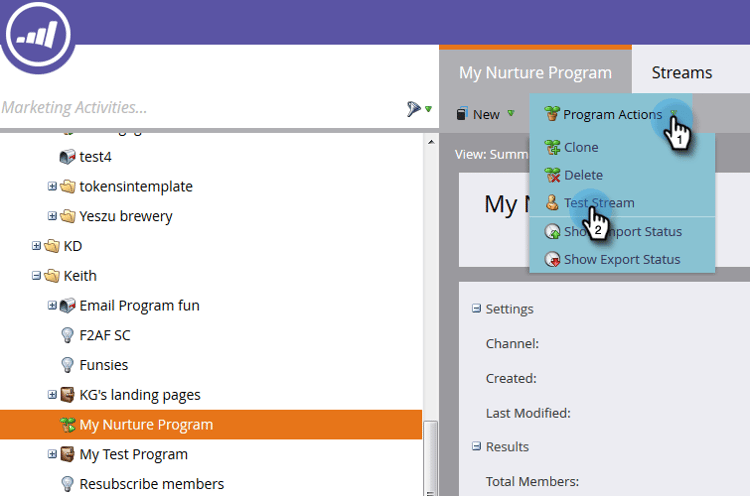 Cliquez sur Actions du programme et sélectionnez Flux de test.