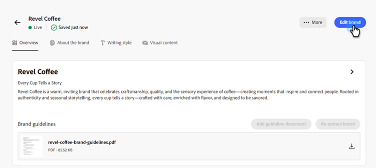 Pour créer et gérer vos directives de marque, vous pouvez saisir vous-même les détails ou charger votre document de directives de marque pour que les informations soient extraites automatiquement.