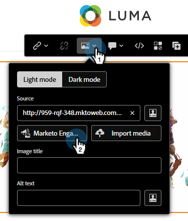 Cliquez sur l’icône Modifier l’image pour remplacer l’image existante pour la variante. Choisissez la source de votre nouvelle image. Dans cet exemple, nous choisissons la bibliothèque Images et fichiers dans notre abonnement Marketo Engage.