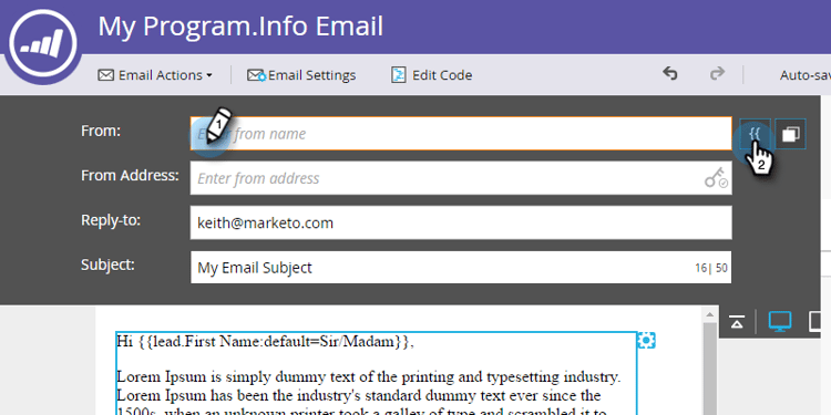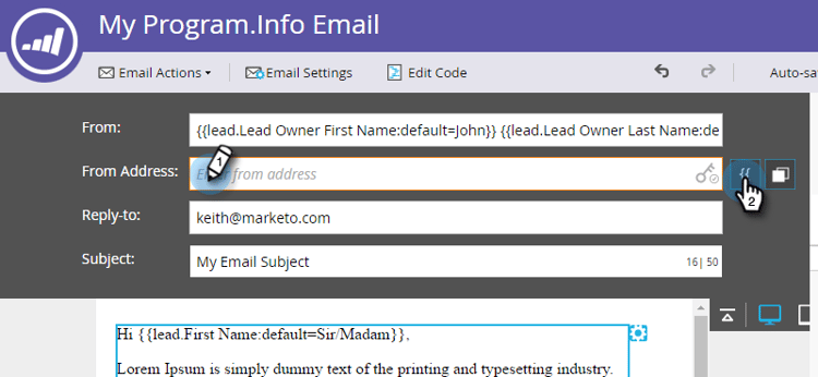 Cliquez dans le champ Adresse de l’expéditeur (supprimez toute adresse e-mail existante), puis cliquez sur le bouton Insérer un jeton.