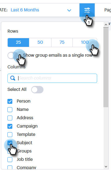 Vous pouvez configurer l’une des colonnes disponibles pour qu’elle soit visible dans la section d’e-mail du Centre de commande. Vos paramètres de configuration seront enregistrés pour chaque sous-dossier d’e-mail (par exemple, Diffusé, En échec, Planifié, etc.).