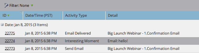 note note NOTE Marketo ajoutera également la date à laquelle il s’est produit et la manière dont le moment intéressant a été ajouté (c’est-à-dire action de lead > étape de flux, API SOAP).