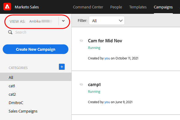 Les administrateurs peuvent afficher les utilisateurs, les campagnes et les catégories de campagne à l’aide du menu déroulant Afficher en tant que.