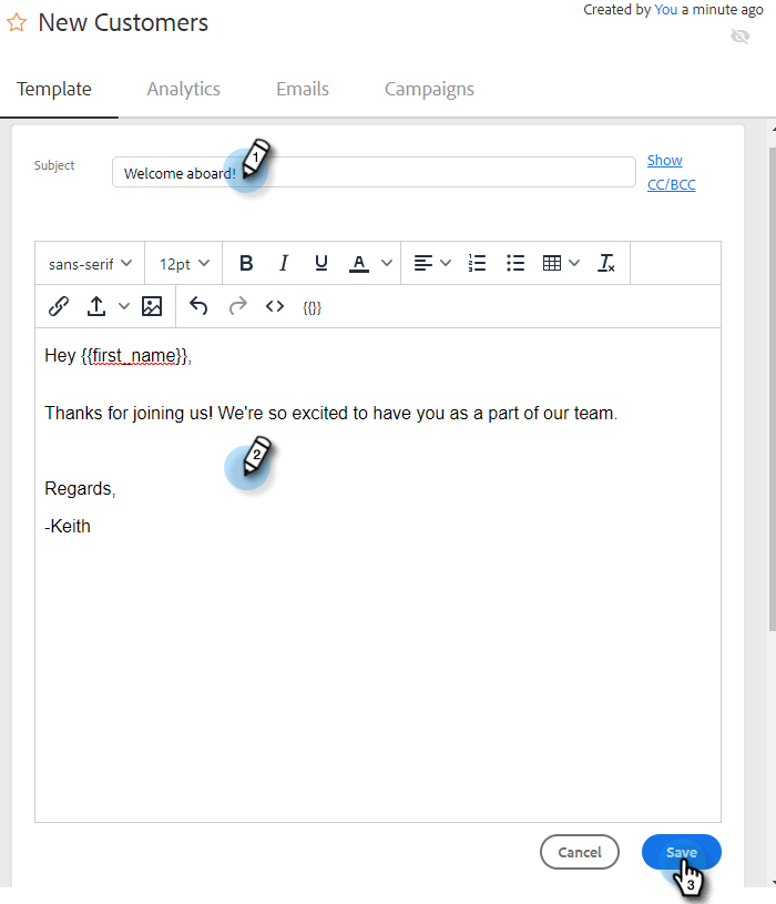 Dans l’éditeur de modèles, créez une ligne d’objet pour votre e-mail et saisissez le message souhaité. Utilisez les outils d’édition (police, taille du texte, etc.) pour personnaliser l’aspect. Cliquez sur Enregistrer pour finaliser vos modifications.