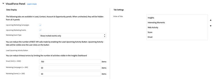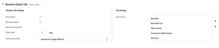 - Paramètres des onglets : les cinq onglets seront disponibles par défaut. Vous pouvez choisir l’ordre des onglets dans la page Marketo Global
