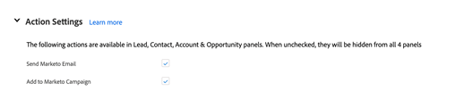 - Ajouter à Marketo Campaign : l’activation de cette option donnera à tous les utilisateurs de Sales Insight l’accès pour ajouter des campagnes à partir des panneaux Lead, Contact, Compte, Opportunité et de l’onglet Meilleurs résultats (actions en masse et engagement intégré)