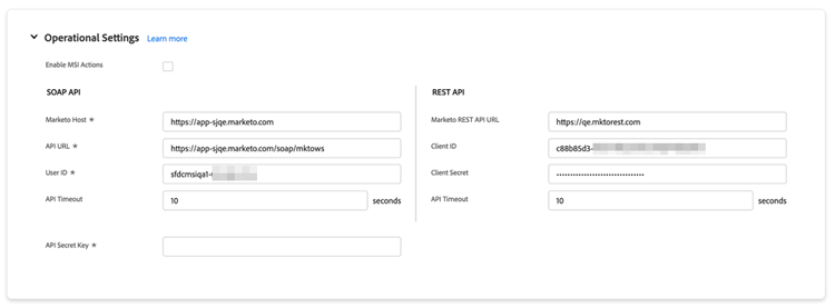 - La page Insight de ventes de votre compte Marketo comporte deux panneaux correspondants avec les informations d’identification d’API Soap et Rest que vous pouvez copier et coller ici