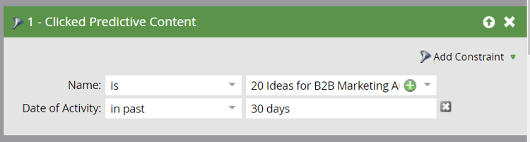 Si vous utilisez la source d’e-mail pour votre contenu prédictif, ajoutez le déclencheur Lien des clics dans l’e-mail. Sélectionnez votre e-mail et ajoutez la contrainte Est prédictif, définie sur true.