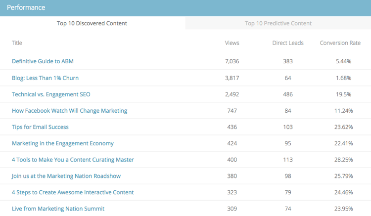 Voici où vous pouvez voir les 10 principaux éléments de contenu découverts, notamment les vues, les prospects directs et le taux de conversion.