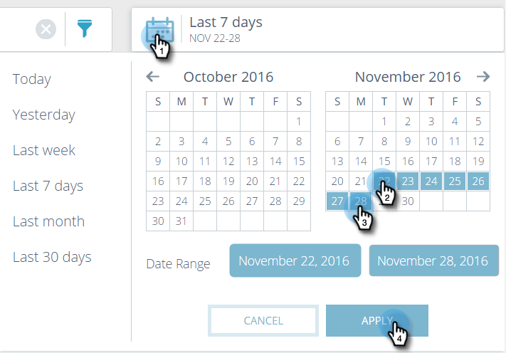 Pour afficher des données pour une date ou une période spécifique, cliquez sur l’icône de calendrier, puis sélectionnez dans le panneau de gauche. Pour une période personnalisée, cliquez sur le premier et le dernier jour de la période du calendrier (comme illustré). Cliquez sur Appliquer.