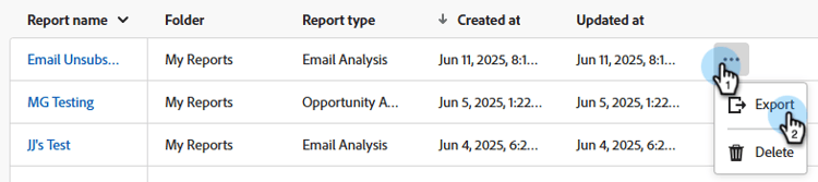 Sur la page Rapports , cliquez sur l’icône « plus » (…) du rapport souhaité, puis sélectionnez Exporter.
