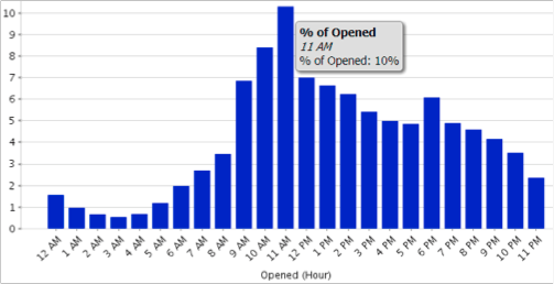 Ce rapport indique le pourcentage d’ouvertures totales d’e-mails à chaque heure de la journée. Le filtre actuel inclut tous les e-mails envoyés au cours des 7 derniers jours. L'heure est au CST.