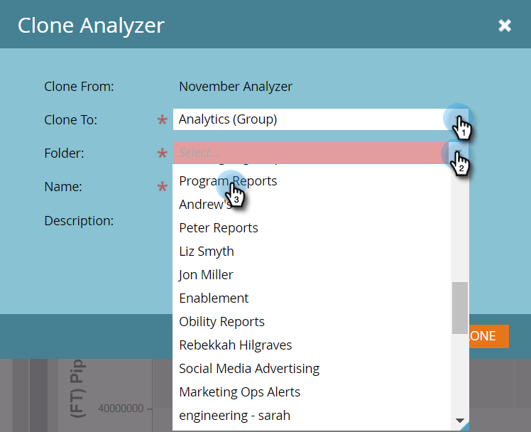 Sélectionnez l’emplacement de l’analyseur cloné dans les listes déroulantes Cloner vers et Dossier.