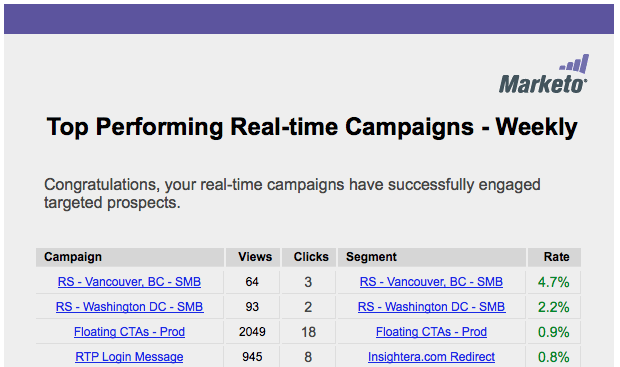 Le rapport Campagnes en temps réel les plus performantes envoie à l’utilisateur un e-mail des campagnes en temps réel les plus performantes, affichant le nom de la campagne, les impressions, les clics, le segment auquel la campagne a réagi et le taux de conversion de la campagne.