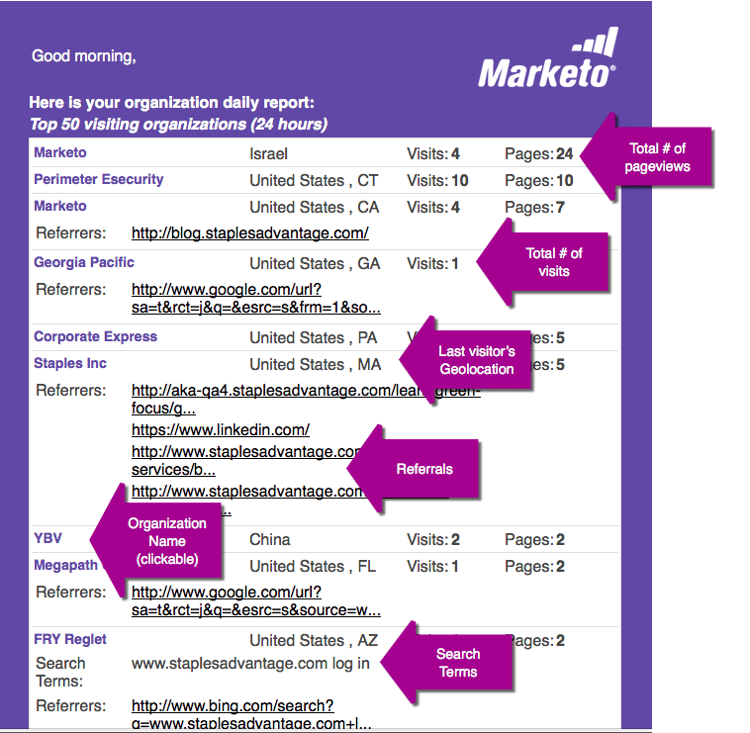 Le rapport quotidien/hebdomadaire envoie à l’utilisateur un e-mail des 50 principales organisations visiteuses, y compris le nom de l’organisation, le lieu, le nombre de visites, les pages vues et le site de référence ou le terme de recherche utilisé.