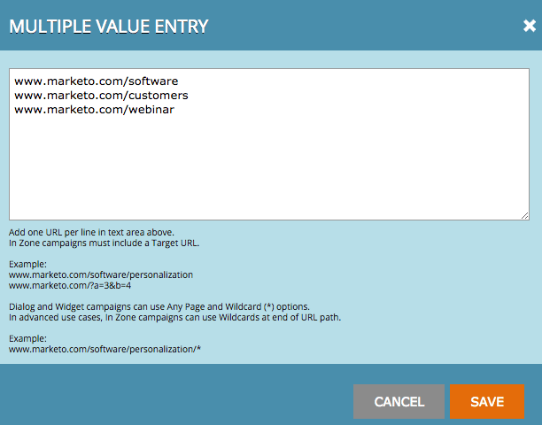 - Dans les cas d’utilisation avancés, les campagnes web Dans la zone peuvent utiliser des caractères génériques à la fin du chemin de l’URL. Exemple : www.marketo.com/software/personalization/*