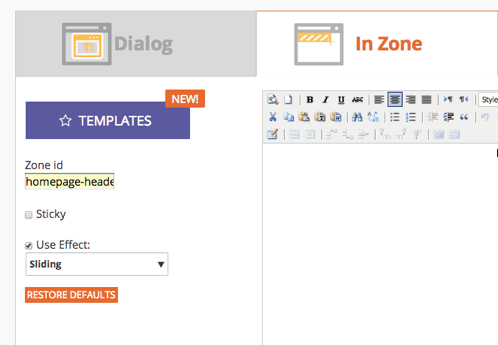 Ajout d’un nouvel effet Glissant pour les campagnes In Zone. Votre contenu personnalisé peut ainsi glisser jusqu’à sa position au chargement de la page.