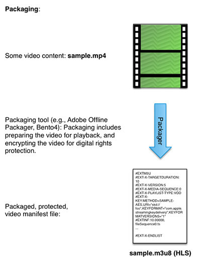 Les packages préparent la vidéo pour la lecture (par exemple, la fragmentation du fichier d’origine et sa mise dans un manifeste), et protègent la vidéo avec la solution DRM de votre choix (dans ce cas, FairPlay) :