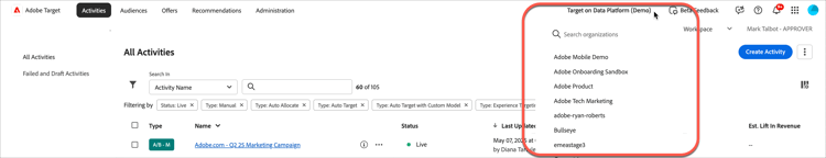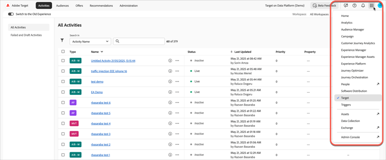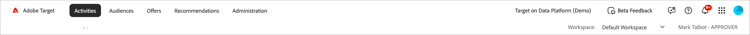 L’en-tête situé en haut de l’interface utilisateur de Target contient des onglets et des options qui vous permettent de parcourir les différentes fonctionnalités de la solution. Vous pouvez également changer d’organisation et de solution de Adobe Experience Cloud, fournir des commentaires si vous faites partie d’un programme Beta, accéder à l’assistant AI, obtenir de l’aide et des notifications, gérer votre profil de Adobe et vous déconnecter de Target.
