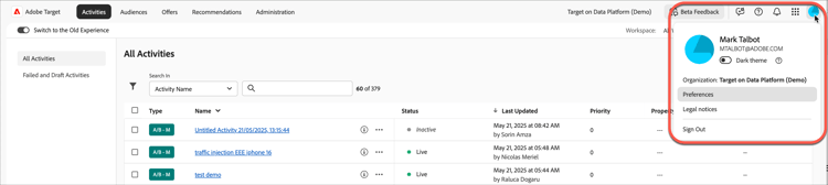 Cliquez sur l’avatar de votre profil pour modifier vos préférences Adobe Experience Cloud ou pour vous déconnecter de Target. Vous pouvez également accéder à votre profil Adobe ou le modifier.