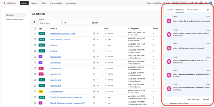 Les panneaux Requests, Notifications et Announcements vous permettent de rester informé sur tout ce qui Adobe Target. Les notifications proactives vous permettent de connaître l’état des solutions Adobe Experience Cloud et des événements Target. Les annonces proactives vous avertissent des événements de panne et de maintenance.