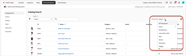 Les environnements utilisent désormais par défaut le dernier utilisé par le client. Pour changer d’environnement, utilisez le sélecteur de Environment dans le coin supérieur droit de l’interface utilisateur de Catalog Search.
