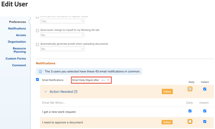 Si vous êtes administrateur ou administratrice Adobe Workfront ou si vous disposez d’un niveau d’accès Planificateur vous permettant de modifier les paramètres d’autres personnes, vous pouvez configurer les paramètres de notification pour plusieurs personnes à la fois. Cela inclut la spécification des notifications reçues par les personnes au fur et à mesure des événements, ou dans un e-mail de synthèse quotidienne, comme décrit dans la section Notifications Adobe Workfront. Pour plus d’informations sur le niveau d’accès requis pour modifier les personnes, voir Accorder l’accès aux personnes.