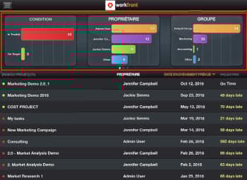 Vous pouvez regrouper les projets selon un critère à la fois. Les critères sont préchargés dans l’application dans les graphiques situés en haut de la liste des projets et ne peuvent pas être modifiés.