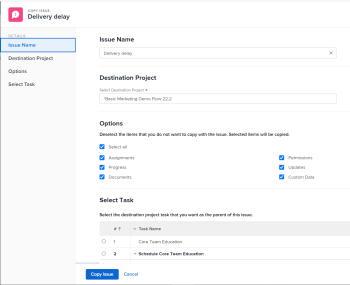 Par défaut, les épreuves et les approbations de documents ne peuvent pas être copiées dans un autre dossier.Autorisations Supprime les entités avec lesquelles le problème est partagé. Mises à jour Supprime les commentaires de la section Mises à jour du problème. Données personnalisées Supprime les informations du formulaire personnalisé relatif au problème, ainsi que les informations des formulaires personnalisés associés aux documents joints à la question, si celles-ci sont également copiées avec le problème. Les formulaires personnalisés resteront joints aux problèmes et aux documents, mais les informations qu’ils contiennent ne seront pas transférées au nouveau problème. -