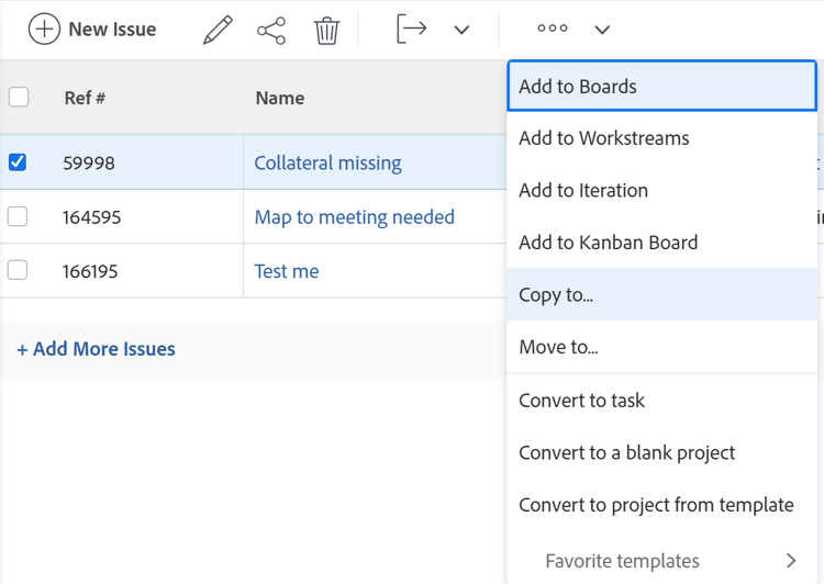 Sélectionnez le ou les problèmes que vous souhaitez copier et cliquez sur le menu Plus en haut de la liste des problèmes, puis cliquez sur Copier sur.