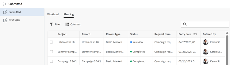 (Facultatif et conditionnel) Si votre entreprise a acheté un package Workfront Planning, cliquez sur l’onglet Planning, puis sur Soumis dans le panneau de gauche pour afficher les demandes Workfront Planning.
