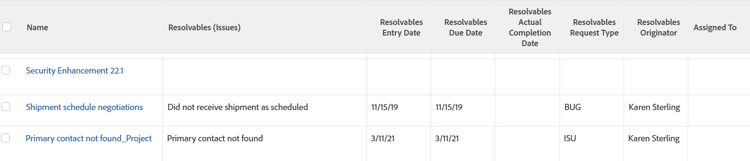 code language-none column.0.textmode=false column.0.valuefield=name column.0.valueformat=HTML column.0.descriptionkey=name column.0.linkedname=direct column.0.listsort=string(name) column.0.namekey=name column.0.querysort=name column.0.shortview=false column.0.stretch=100 column.0.width=150 column.1.displayname=Resolvables (Issues) column.1.listdelimiter= column.1.listmethod=nested(resolvables).lists column.1.textmode=true column.1.type=iterate column.1.valueexpression={name} column.1.valueformat=HTML column.2.displayname=Resolvables Entry Date column.2.listdelimiter= column.2.listmethod=nested(resolvables).lists column.2.textmode=true column.2.type=iterate column.2.valueexpression={entryDate} column.2.valueformat=HTML column.3.displayname=Resolvables Due Date column.3.listdelimiter= column.3.listmethod=nested(resolvables).lists column.3.textmode=true column.3.type=iterate column.3.valueexpression={plannedCompletionDate} column.3.valueformat=HTML column.4.displayname=Resolvables Actual Completion Date column.4.listdelimiter= column.4.listmethod=nested(resolvables).lists column.4.textmode=true column.4.type=iterate column.4.valueexpression={actualCompletionDate} column.4.valueformat=HTML column.5.displayname=Resolvables Request Type column.5.listdelimiter= column.5.listmethod=nested(resolvables).lists column.5.textmode=true column.5.type=iterate column.5.valueexpression={opTaskType} column.5.valueformat=HTML column.6.displayname=Resolvables Originator column.6.listdelimiter= column.6.listmethod=nested(resolvables).lists column.6.textmode=true column.6.type=iterate column.6.valueexpression={owner}.{name} column.6.valueformat=HTML column.7.descriptionkey=assignedto column.7.linkedname=assignedTo column.7.listsort=nested(assignedTo).string(name) column.7.namekey=assignedto column.7.querysort=assignedTo:name column.7.shortview=false column.7.stretch=0 column.7.textmode=true column.7.valuefield=assignedTo:name column.7.valueformat=HTML column.7.width=150 -