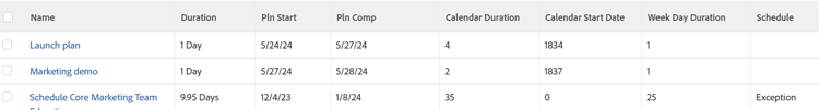 code language-none column.0.descriptionkey=name column.0.link.linkproperty.0.name=ID column.0.link.linkproperty.0.valuefield=ID column.0.link.linkproperty.0.valueformat=int column.0.link.lookup=link.view column.0.link.valuefield=objCode column.0.link.valueformat=val column.0.linkedname=direct column.0.listsort=string(name) column.0.namekey=name.abbr column.0.querysort=name column.0.shortview=false column.0.stretch=100 column.0.valuefield=name column.0.valueformat=HTML column.0.width=150 column.1.descriptionkey=duration column.1.linkedname=direct column.1.listsort=intAsInt(durationMinutes) column.1.namekey=duration.abbr column.1.querysort=durationMinutes column.1.shortview=false column.1.stretch=0 column.1.valuefield=durationFieldLong column.1.valueformat=compound column.1.viewalias=duration column.1.width=80 column.2.descriptionkey=plannedstartdate column.2.linkedname=direct column.2.listsort=atDateAsAtDate(plannedStartDate) column.2.namekey=plannedstartdate.abbr column.2.querysort=plannedStartDate column.2.shortview=false column.2.stretch=0 column.2.valuefield=plannedStartDate column.2.valueformat=atDate column.2.width=80 column.3.descriptionkey=plannedcompletiondate column.3.linkedname=direct column.3.listsort=atDateAsAtDate(plannedCompletionDate) column.3.namekey=plannedcompletiondate.abbr column.3.querysort=plannedCompletionDate column.3.shortview=false column.3.stretch=0 column.3.valuefield=plannedCompletionDate column.3.valueformat=atDate column.3.width=80 column.4.aggregator.displayformat=int column.4.aggregator.function=SUM column.4.aggregator.namekey=id column.4.aggregator.valueexpression=DATEDIFF({plannedCompletionDate}, {plannedStartDate})+1 column.4.aggregator.valueformat=intAsInt column.4.descriptionkey=id column.4.linkedname=direct column.4.listsort=intAsInt(ID) column.4.name=Calendar Duration column.4.querysort=ID column.4.shortview=false column.4.stretch=0 column.4.valueexpression=DATEDIFF({plannedCompletionDate},{plannedStartDate})+1 column.4.valueformat=int column.4.width=80 column.5.aggregator.displayformat=int column.5.aggregator.function=SUM column.5.aggregator.namekey=id column.5.aggregator.valueexpression=DATEDIFF({plannedStartDate},{project}. {plannedStartDate})+0 column.5.aggregator.valueformat=intAsInt column.5.descriptionkey=id column.5.linkedname=direct column.5.listsort=intAsInt(ID) column.5.name=Calendar Start Date column.5.querysort=ID column.5.shortview=false column.5.stretch=0 column.5.valueexpression=DATEDIFF({plannedStartDate},{project}.{plannedStartDate})+0 column.5.valueformat=int column.5.width=80 column.6.aggregator.displayformat=int column.6.aggregator.function=SUM column.6.aggregator.namekey=id column.6.aggregator.valueexpression=WEEKDAYDIFF({plannedStartDate}, {plannedCompletionDate})+0 column.6.aggregator.valueformat=HTML column.6.descriptionkey=id column.6.linkedname=direct column.6.listsort=intAsInt(ID) column.6.name=Week Day Duration column.6.querysort=ID column.6.shortview=false column.6.stretch=0 column.6.valueexpression=WEEKDAYDIFF({plannedStartDate},{plannedCompletionDate})+0 column.6.valueformat=int column.6.width=80 column.7.aggregator.displayformat=int column.7.aggregator.expression=IF((WEEKDAYDIFF({plannedStartDate},{plannedCompletionDate}))>({duration}/480),"Exception","") column.7.aggregator.function=SUM column.7.aggregator.namekey=id column.7.aggregator.valueformat=HTML column.7.linkedname=direct column.7.listsort=intAsInt(ID) column.7.name=Schedule column.7.querysort=ID column.7.shortview=false column.7.stretch=0 column.7.valueexpression=IF((WEEKDAYDIFF({plannedStartDate},{plannedCompletionDate}))>({duration}/480),"Exception","") column.7.valueformat=HTML column.7.width=80 -