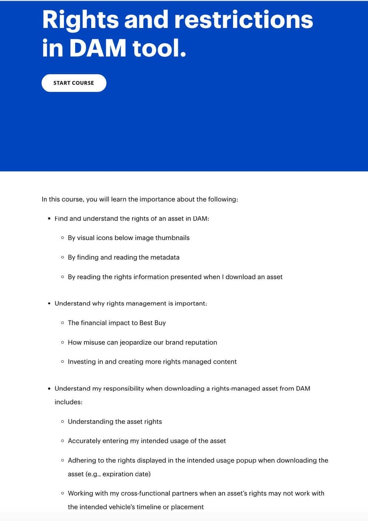 Le eLearning commence par un message du Vice-Président principal de Creative and Media, rappelant aux utilisateurs er utilisatrices en quoi Rights Management est important, ainsi que leur rôle dans ce domaine. L’eLearning poursuit en expliquant comment identifier les ressources gérées par des droits et l’importance de respecter les droits d’utilisation.