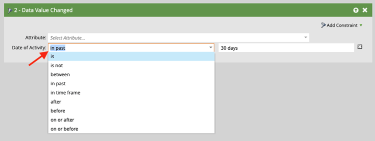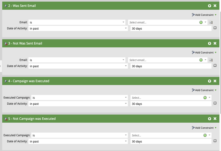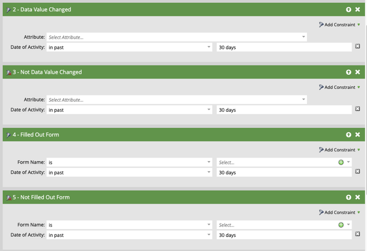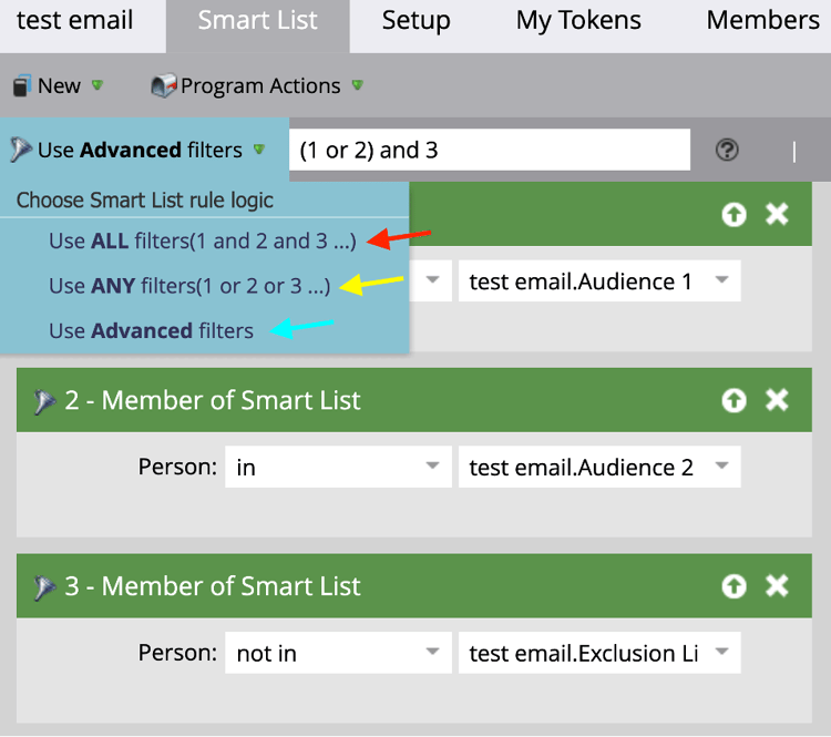However, in using this approach, another level of logic is created: Member of Smart List is or Member of Smart List is not. Depending on the type of smart lists you are creating (inclusionary lists vs exclusionary lists), make sure you select the right filter constraint operator.