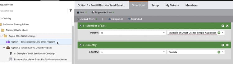 On the other hand, a complex audience (multiple audiences and many fields) must be built within a separate Smart List that is then referenced in the Smart List tab of either the Email Send Program or the Send Smart Campaign in the Default Program.