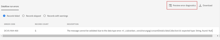 Sources > Flux de données > Prévisualiser le diagnostic d’erreur : vous obtenez ainsi une prévisualisation de 100 erreurs au maximum.