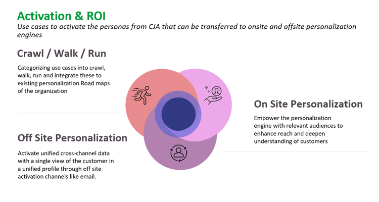 Pour démontrer efficacement le retour sur investissement, nous devons associer l’exploitabilité des informations tirées de CJA à des résultats mesurables, tels que les recettes obtenues et les améliorations des scores d’expérience client (CX). Le niveau de personnalisation requis dépend de la pile technologique en place pour faciliter le transfert d’audience depuis CJA.