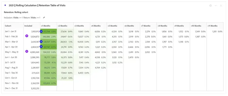 - Les mois avec les taux de rétention les plus élevés +1 mois comprennent janvier, avril et novembre (les mêmes mois que le premier tableau de cohortes)